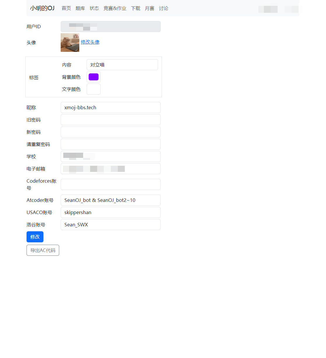 小明的OJ增强脚本 (XMOJ-Script) 在多个方面提供了有益的功能和改进。 首先,通过比赛ACM排名和下载功能,用户可以更方便地浏览比赛的排名情况,并且能够将相关信息下载以备离线查阅,这对于参赛者和观众来说都是一项实用的功能。 界面美化方面,采用新版的Bootstrap样式库、彩色文字和暗色模式等,能够显著提升用户界面的视觉吸引力和舒适度。